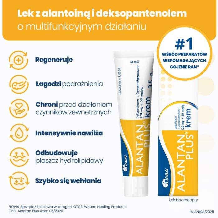 Działanie: Alantan Plus ma postać kremu do stosowania miejscowego na skórę. Lek zawiera dwie substancje czynne: alantoinę i deksopantenol. Alantoina działa złuszczająco oraz osłaniająco na skórę, poprawia jej nawilżenie oraz wspomaga leczenie ran przez pobudzanie wzrostu nowej tkanki. Alantoina stosowana regularnie w nadmiernym rogowaceniu skóry, może zapobiec nadmiernemu odkładaniu się keratyny (rodzaj białka). Deksopantenol głęboko wnika w skórę, gdzie przekształca się w kwas pantotenowy. Zwiększone zapotrzebowanie na kwas pantotenowy występuje w przypadku uszkodzeń i różnego rodzaju chorób skóry. Deksopantenol ma zdolność wiązania wody, dzięki czemu zwiększa elastyczność skóry.