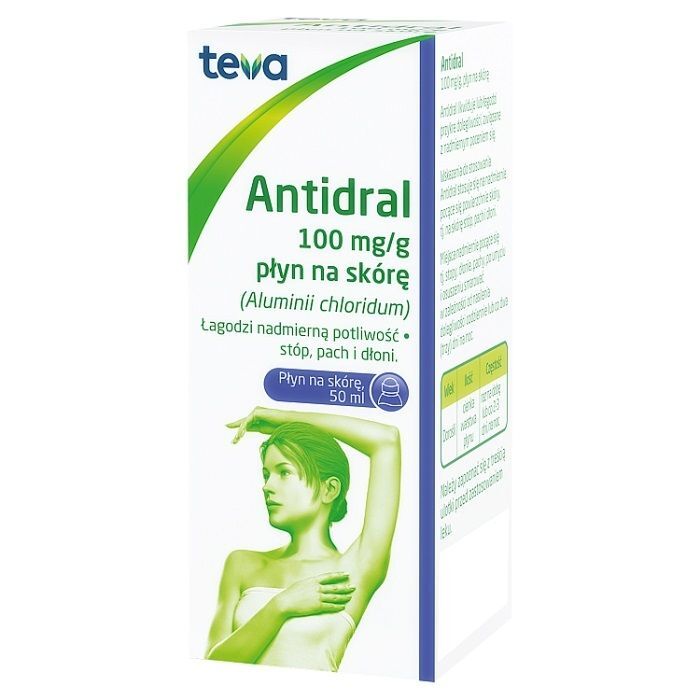 Działanie: Antidral zawiera chlorek glinowy, który zmniejsza aktywność gruczołów potowych poprzez denaturację białek zawartych w gruczołach i łączenie się z włóknami fibrynowymi, stanowiącymi zakończenia gruczołów wydzielania zewnętrznego. Po zastosowaniu płynu ciśnienie wewnątrz światła przewodu potowego wzrasta (system sprzężenia zwrotnego), w wyniku czego zahamowane zostaje wydzielanie potu z gruczołów potowych. Pozostałe składniki leku ułatwiają wchłanianie substancji czynnej oraz znacznie ograniczają możliwość wystąpienia zakażeń naskórka.