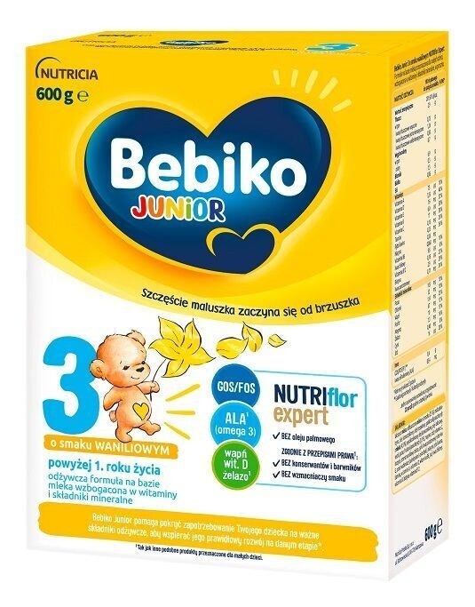 Podawaj dziecku 2 kubki po 200ml Bebiko Junior 3 NutriFlor Expert o smaku waniliowym dziennie, jako część zróżnicowanej diety. Bebiko Junior 3 NutriFlor Expert może również służyć do przygotowywania kleików i bezmlecznych kaszek BoboVita.