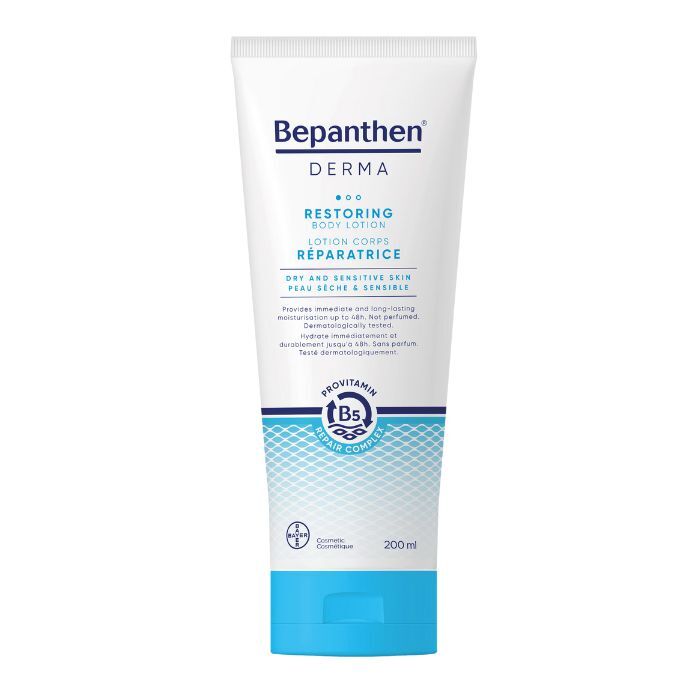 Bepanthen Derma Restoring to nawilżająco-odżywczy balsam do ciała przeznaczony do pielęgnacji suchej, wrażliwej i skłonnej do podrażnień skóry. Formuła produktu zawiera kluczowe składniki, takie jak pantenol (prowitamina B5), gliceryna, lanolina, skwalan, masło shea, olej arganowy oraz niacynamid, które wspólnie łagodzą suchość i uczucie napięcia skóry, zapewniając jej miękkość i gładkość. Balsam wspiera naturalną równowagę mikrobiomu skóry oraz odbudowuje jej barierę ochronną, dzięki czemu nawilżenie utrzymuje się nawet do 48 godzin.