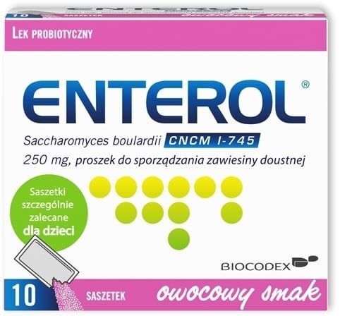 Wskazania: lek Enterol jest stosowany w: leczeniu ostrych biegunek infekcyjnych; zapobieganiu biegunkom poantybiotykowym; nawracającej biegunce spowodowanej zakażeniem Clostridium difficile, jako dodatek do leczenia wankomycyną lub metronidazolem; zapobieganiu biegunkom związanym z żywieniem dojelitowym; zapobieganiu biegunkom podróżnych.
