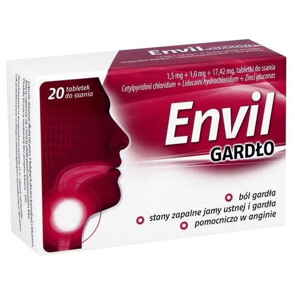 Wskazania: produkt antyseptyczny i miejscowo znieczulający z dodatkiem cynku do stosowania w stanach zapalnych gardła i jamy ustnej. Lek Envil gardło może być stosowany pomocniczo w leczeniu zakażeń górnych dróg oddechowych połączonych z bólem gardła oraz w zapaleniu migdałków (angina).