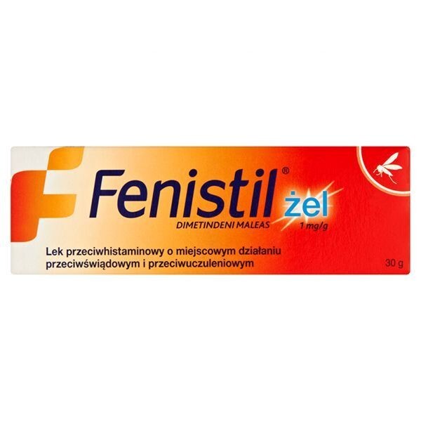 Działanie: lek Fenistil ma postać żelu do stosowania na skórę. Fenistil zawiera substancję czynną dimetyndenu maleinian, który hamuje działanie histaminy – związku odpowiedzialnego za reakcje alergiczne. Lek stosowany na skórę działa miejscowo przeciwuczuleniowo, silnie przeciwświądowo (z wyłączeniem świądu cholestatycznego), zmniejsza obrzęk, łagodzi podrażnienia. Wykazuje miejscowe właściwości znieczulające. Chłodzi, co dodatkowo łagodzi podrażnioną skórę.