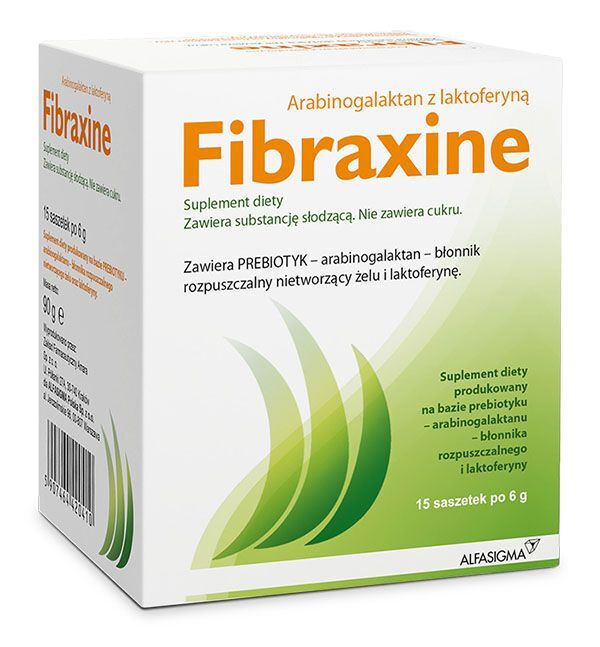 Suplement diety Fibraxine stanowi połączenie arabinogalaktanu i laktoferyny. Arabinogalaktan jest naturalnym błonnikiem, pozyskiwanym z kory modrzewia, w prostym procesie wykorzystującym wyłącznie parę wodną. Jest łatwy do połknięcia, ponieważ po rozpuszczeniu nie tworzy żelu. Nie wymaga popijania dużą ilością płynów. Nie zmienia konsystencji pokarmu, w którym jest rozpuszczany np. soku, herbaty, jogurtu. Ma przyjemny smak. Laktoferyna to naturalna glikoproteina, której źródłem jest mleko większości ssaków.