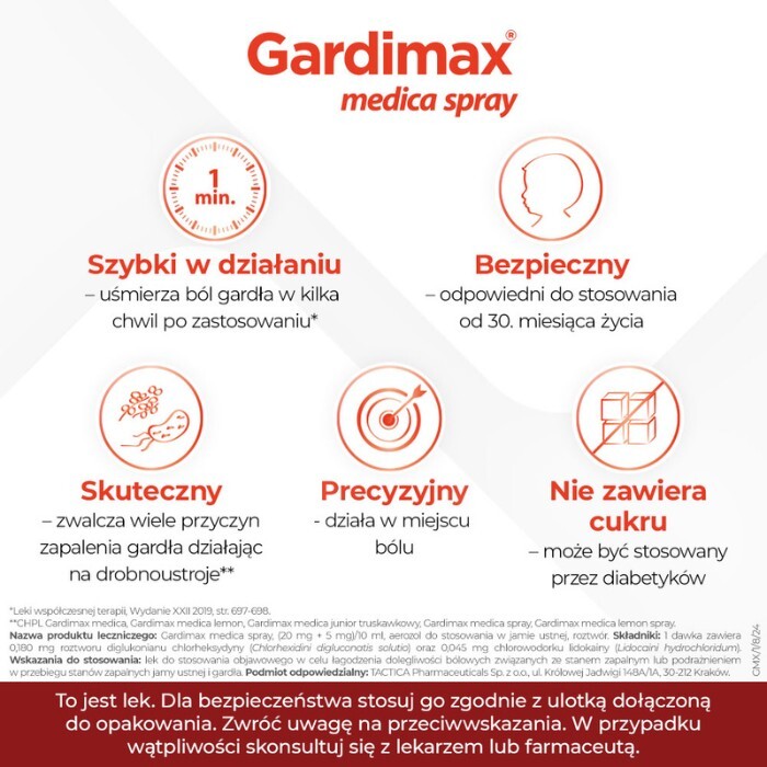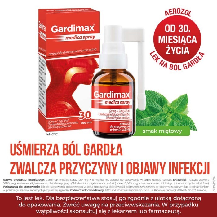Lek Gardimax medica spray zawiera substancje czynne lidokainy chlorowodorek o działaniu miejscowo znieczulającym oraz chlorheksydyny diglukonian o działaniu przeciwbakteryjnym.