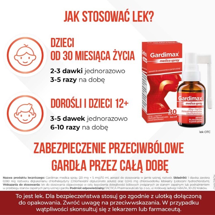 Uczulenie (nadwrażliwość) na diglukonian chlorheksydyny lub chlorowodorek lidokainy lub którykolwiek z pozostałych składników leku Gardimax medica spray. Nie stosować u dzieci w wieku poniżej 2,5 roku (30 miesięcy). Należy skonsultować się z lekarzem, jeśli którekolwiek z powyższych przeciwwskazań dotyczy pacjenta, lub dotyczyło w przeszłości.