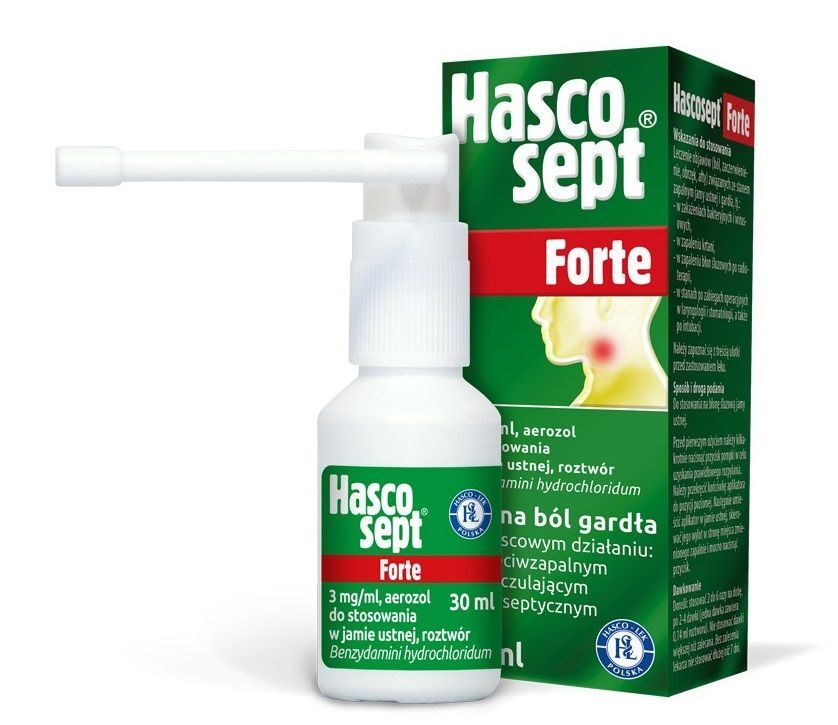 Działanie: substancją czynną leku jest chlorowodorek benzydaminy, który działa przeciwzapalnie i przeciwbólowo. Hascosept Forte stosowany miejscowo działa znieczulająco i odkażająco.