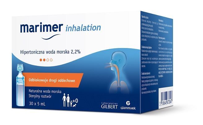 Marimer Inhalation hipertoniczna woda morska do nebulizacji. Naturalne składniki pochodzenia morskiego sprawiają, że produkt jest zalecany już do 1 dnia życia, dla noworodków, niemowląt, dzieci i dorosłych w celu nawilżenia i odblokowania dróg oddechowych w przypadku zatkania, utrudnionego oddychania, świszczącego oddechu lub przewlekłego kaszlu. Osmotyczne działanie produktu pomaga rozrzedzić i usunąć nadmiar wydzieliny śluzowej poprzez pobudzenie wydzielania w drogach oddechowych. Ułatwia oddychanie i poprawia jakość życia. Roztworu można używać w formie inhalacji lub aerozoloterapii.